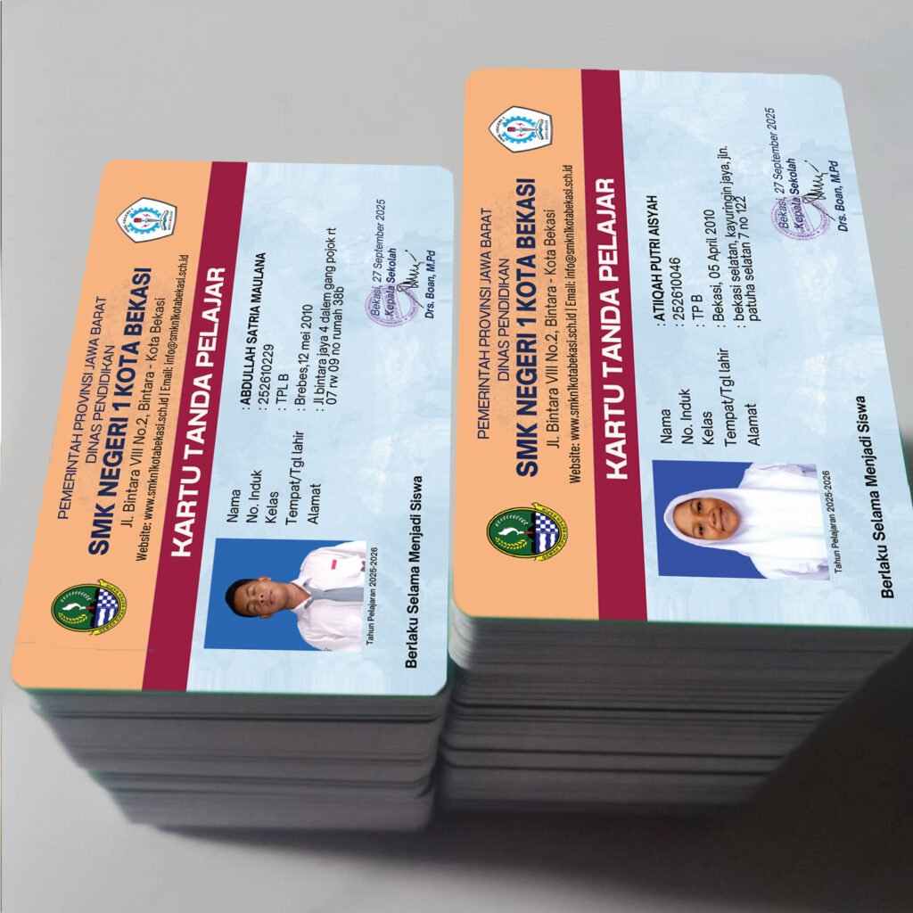 Kartu pelajar dan mahasiswa dengan desain menarik. Aman, tahan lama, dan bisa include foto siswa beserta data siswa.
